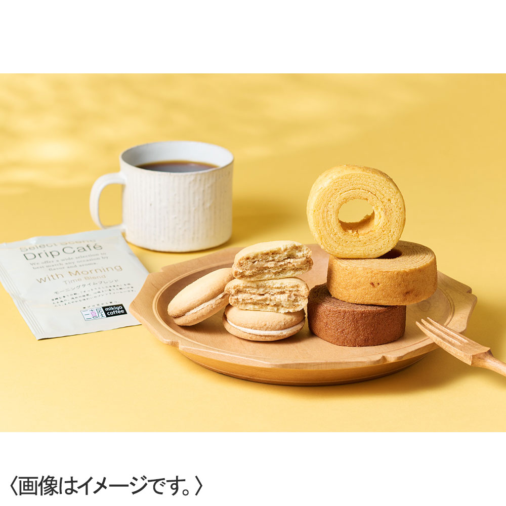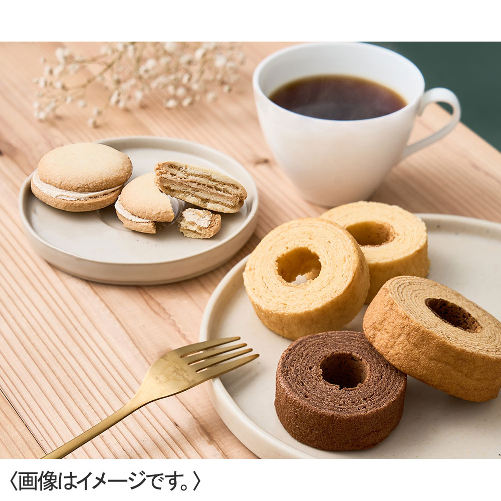 ふんわりバームクーヘン(ミルク・ココア×各1個、黒糖×2個)、七層のキャラメルサンドクッキー×2個、三喜屋珈琲のレギュラーコーヒー×2袋