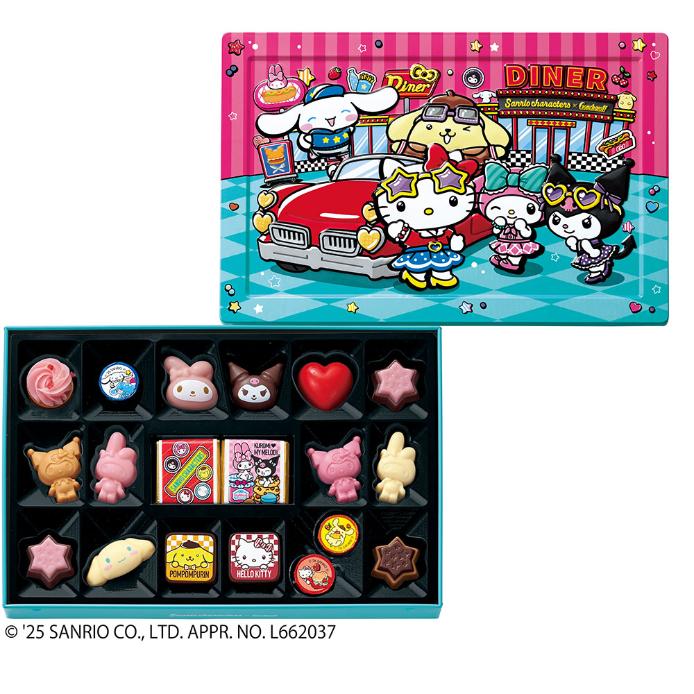 「アメリカンダイナー」前に集まったクロミ・マイメロディ・ポムポムプリン・ハローキティ・シナモロールを描いた立体缶に、キャラクターの顔型プリントチョコレートをはじめ、キャラクター勢ぞろいのチョコレートを詰合せました。缶のイラストはこのブランドのために描きおろされたオリジナルデザインです。