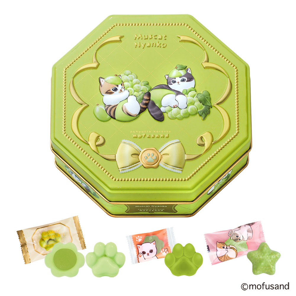 八角形のエンボス缶に、マスカット風味の肉球型グミチョコレート、クランチ、肉球型グミをアソートしました