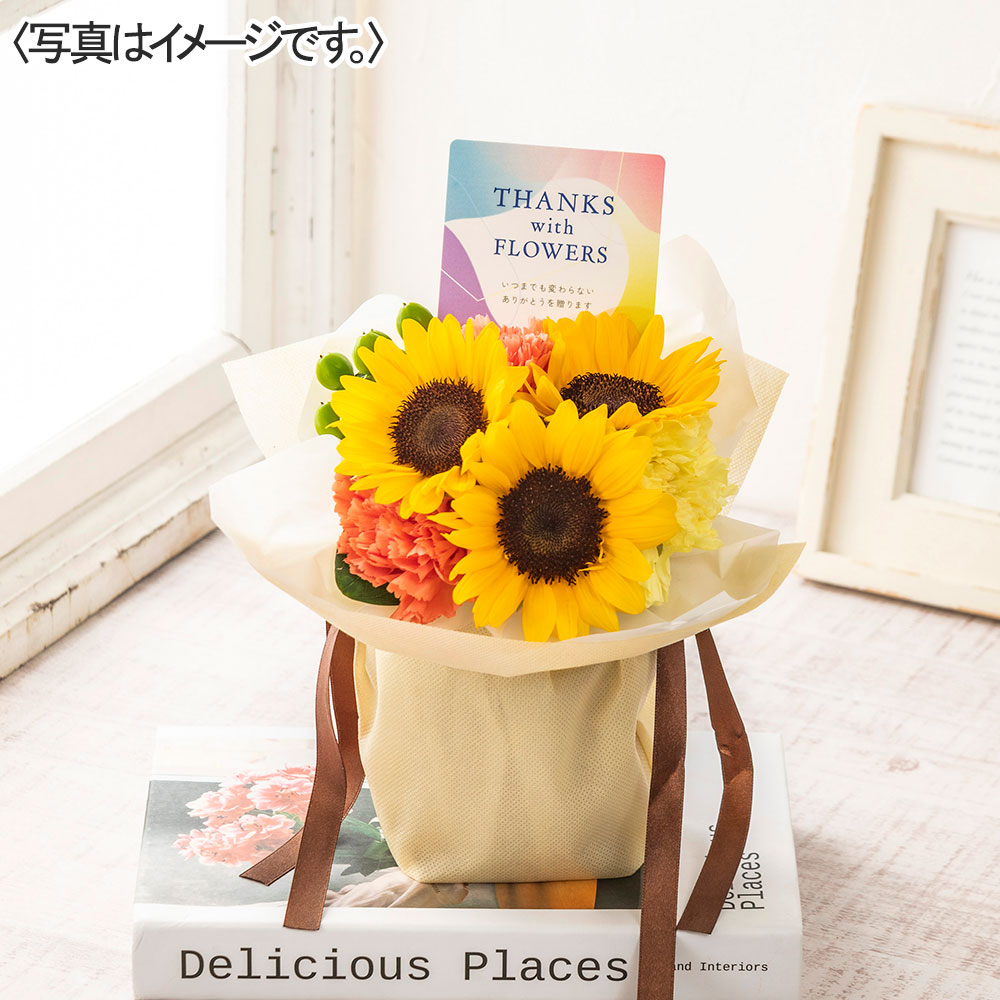 商品内容:ヒマワリ× 3 、カーネーション(オレンジ × 2 、 イエロー × 1 )、ヒペリカム、リボン付袋、メッセージピック