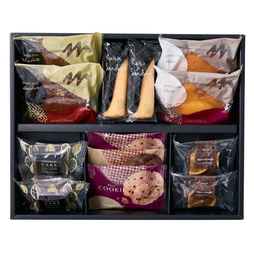 ブラウニーネーブル・レーズンサンド・マドレーヌ(プレーン・チョコ)・チョコレートケーキ・レーズンクッキー×各2個、チョコチップクッキー×1個、HOS-04A