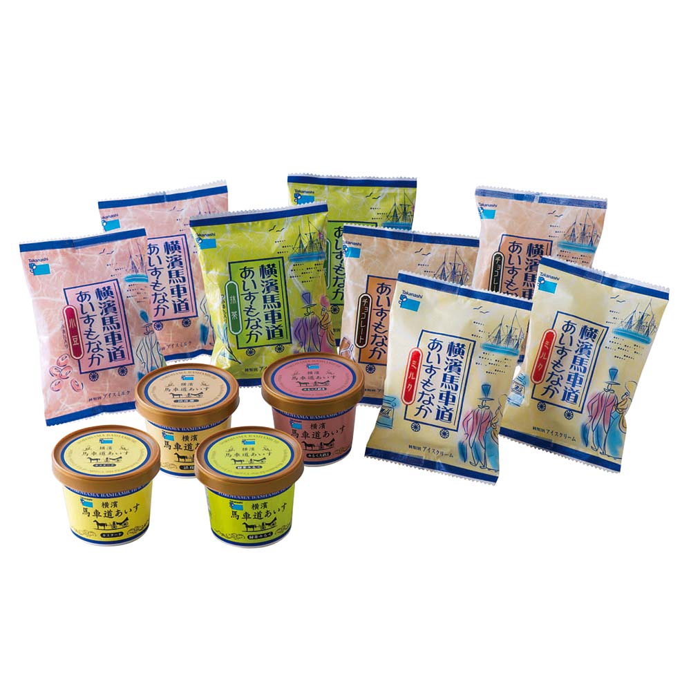 横濱馬車道あいすもなか65ml(ミルク・抹茶・小豆・チョコレート×各2個)、横濱馬車道あいす110ml(カスタード・渋皮栗・みるく大納言・緑茶みるく×各1個)、TBW2Y