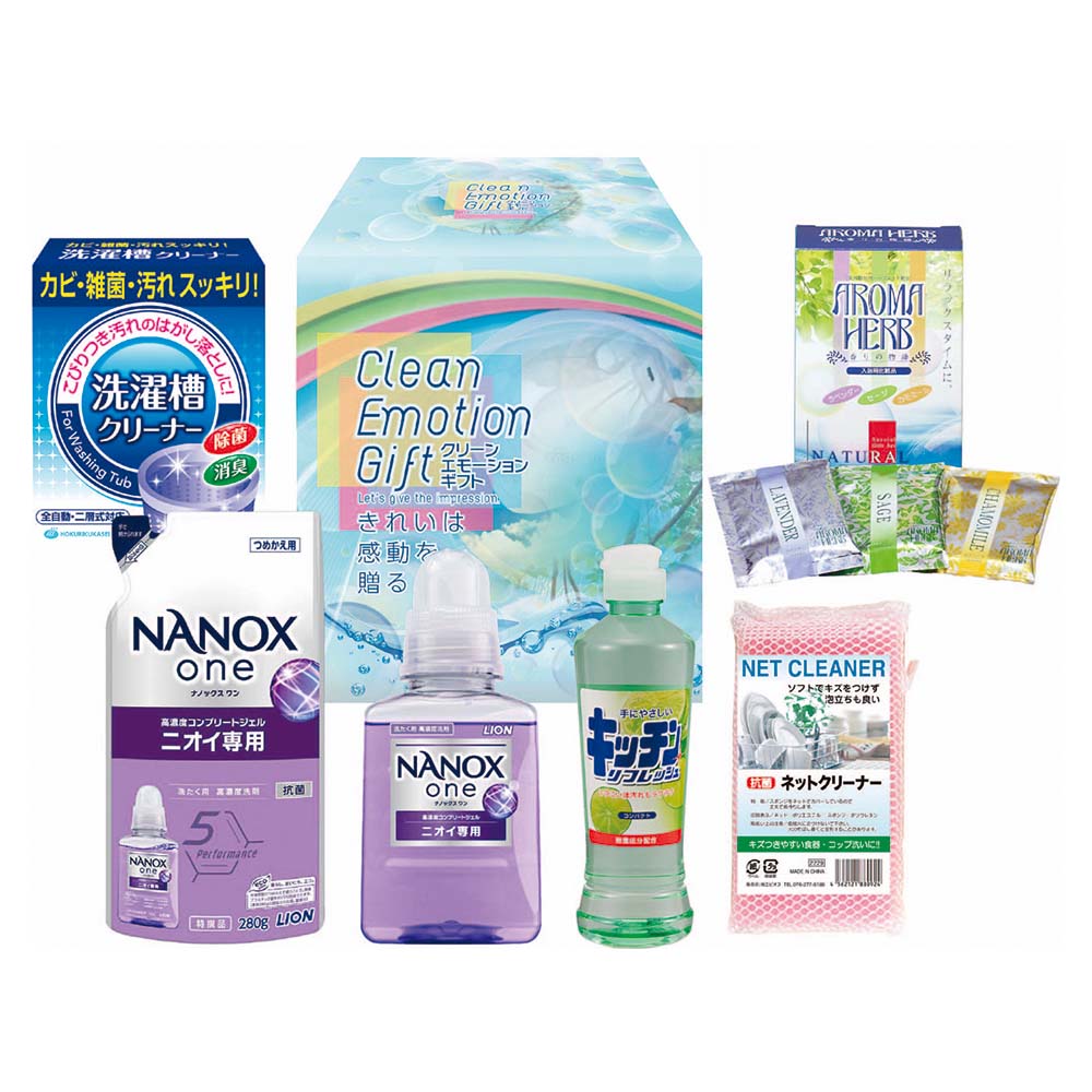ライオンNANOXone380g・ライオンNANOXone詰替用280g・キッチンリフレッシュコンパクト270ml・洗濯槽クリーナー(50g×2包入)・ハーブエキス配合入浴料(30g×3包入)・ネットクリーナー×各1、CEG-305