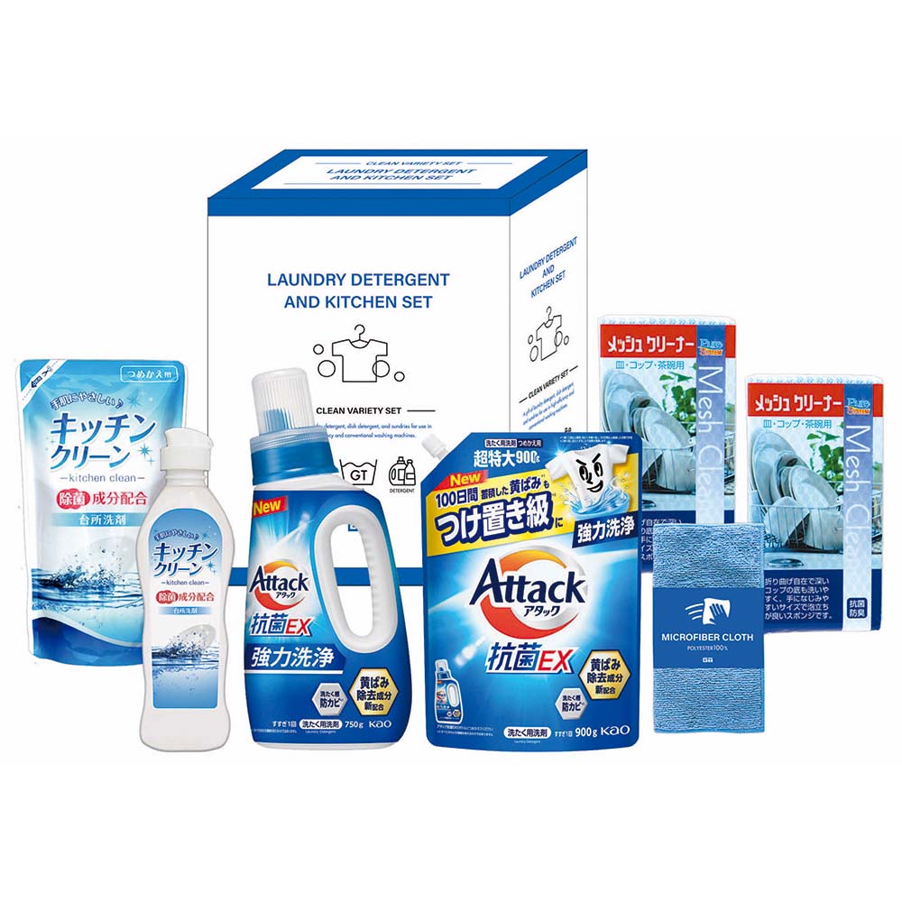 花王アタック抗菌EX本体750g・花王アタック抗菌EX詰替900g・キッチンクリーン250ml・キッチンクリーン詰替200ml・マイクロファイバークロス(約20×20cm)×各1、メッシュクリーナー×2、X-52E