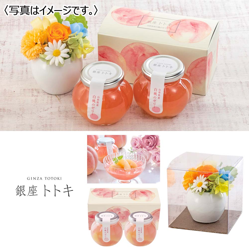 プリザーブドフラワー(バラ、アジサイ)、サボンドゥフルール(カーネーション、マーガレット)、アーティフィシャルフラワー(アジサイ、グリーン)、リボン、陶製花器、Thanksカード、お手入れのしおり付、「銀座トトキ監修」山形県産白桃のゼリー2個入り