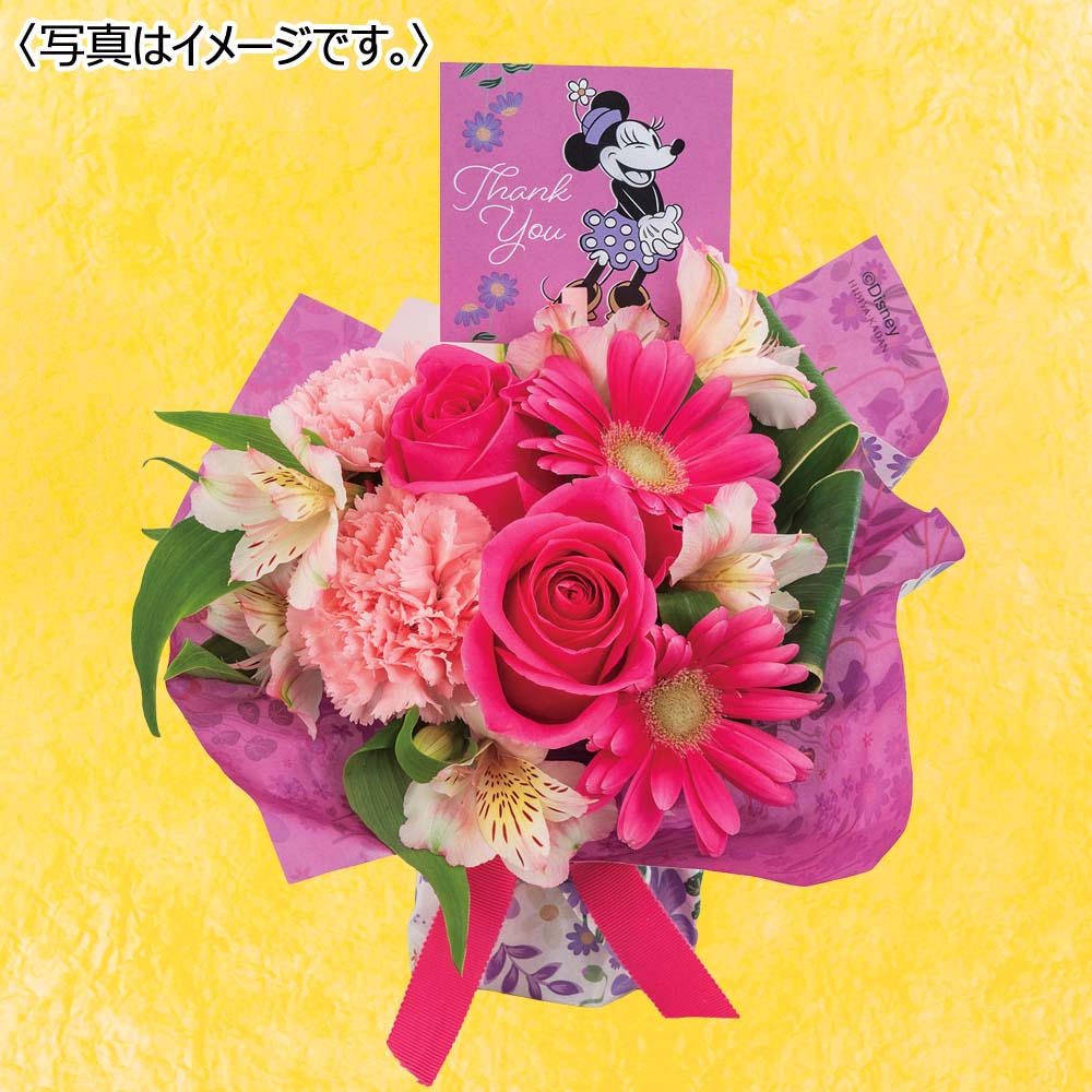 バラ×2、カーネーション×2、ガーベラ×2、アルストロメリア×1、グリーン、ラッピング、リボン、お手入れのしおり、Thanksカード、ディズニーカード