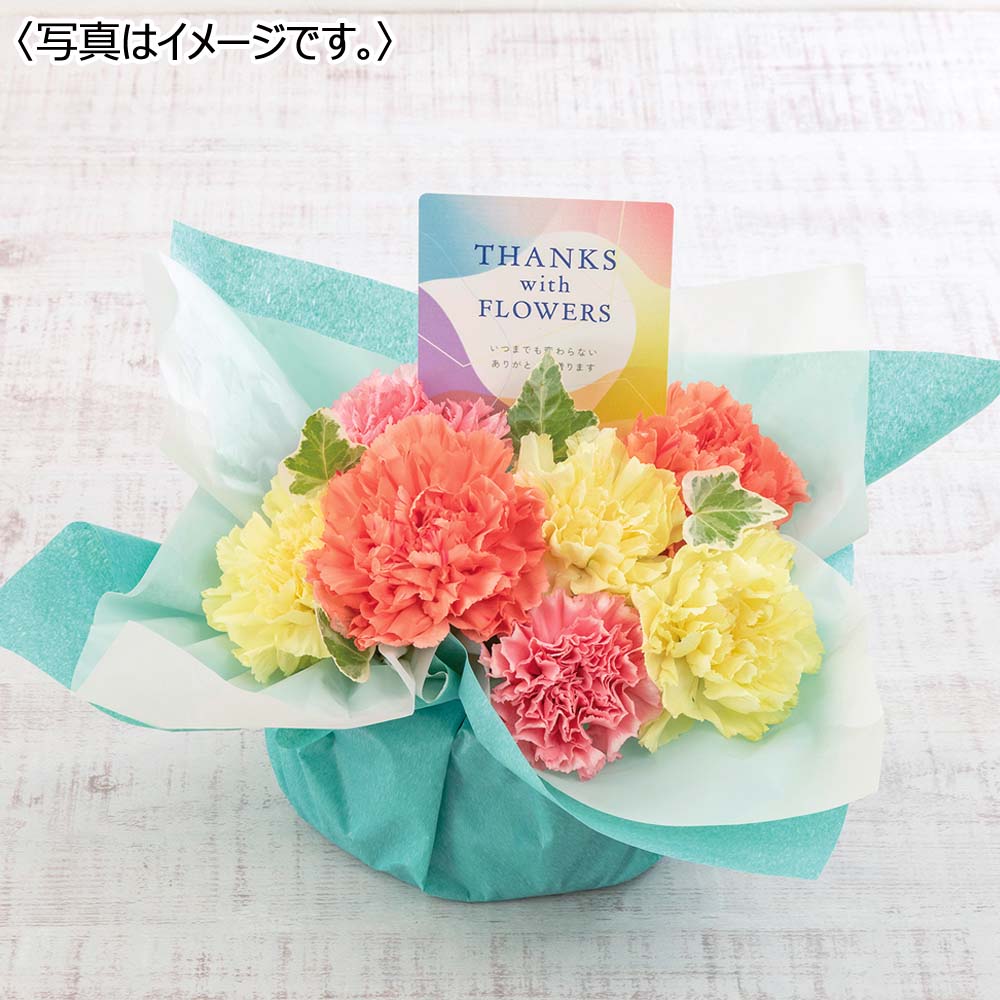 カーネーション(オレンジ×2、イエロー×3、ピンク×2)、グリーン、ラッピング、メッセージピック、Thanksカード、お手入れのしおり付