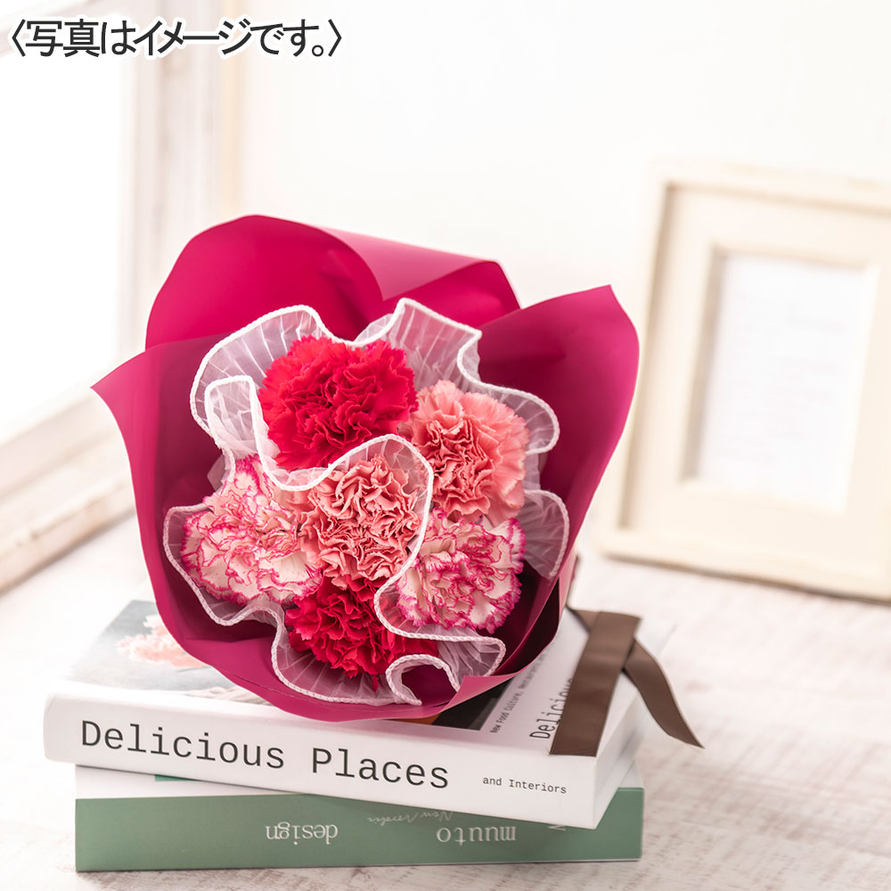 商品内容:カーネーション(濃いピンク×2、ピンク×2、複色ピンクホワイト×2)、ラッピング、リボン