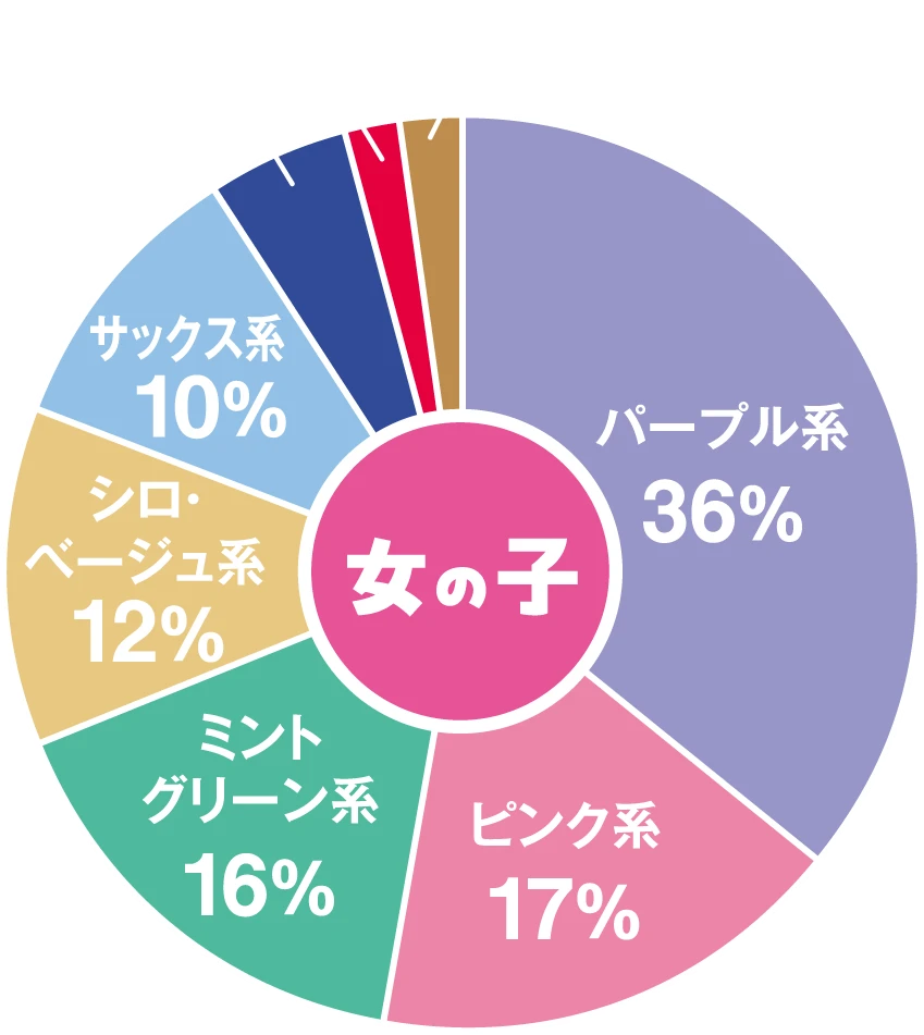 現在では「女の子=赤」という意識は薄れ、近年ではパープルやピンク、ミントグリーンなど落ち着いた淡い色合いの「くすみカラー」がトレンド。おしゃれで大人っぽい印象に。