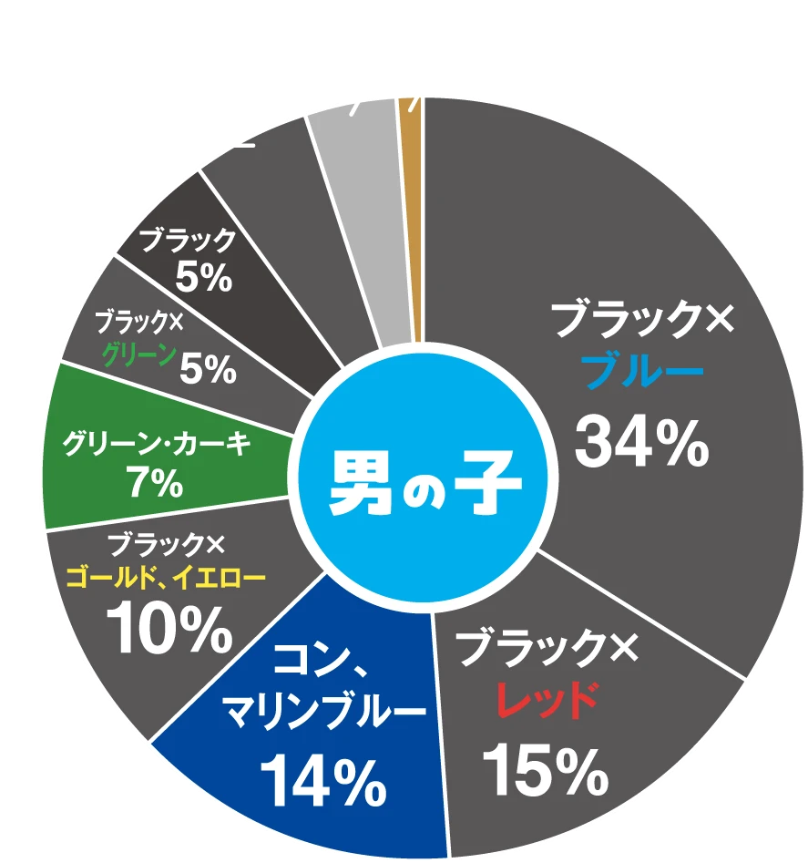 クロ系が74%、中でもステッチに青や赤など配色にアクセントがあるものが人気。他にも、ブルーやグリーン、シルバーなど個性派カラーも人気上昇中。